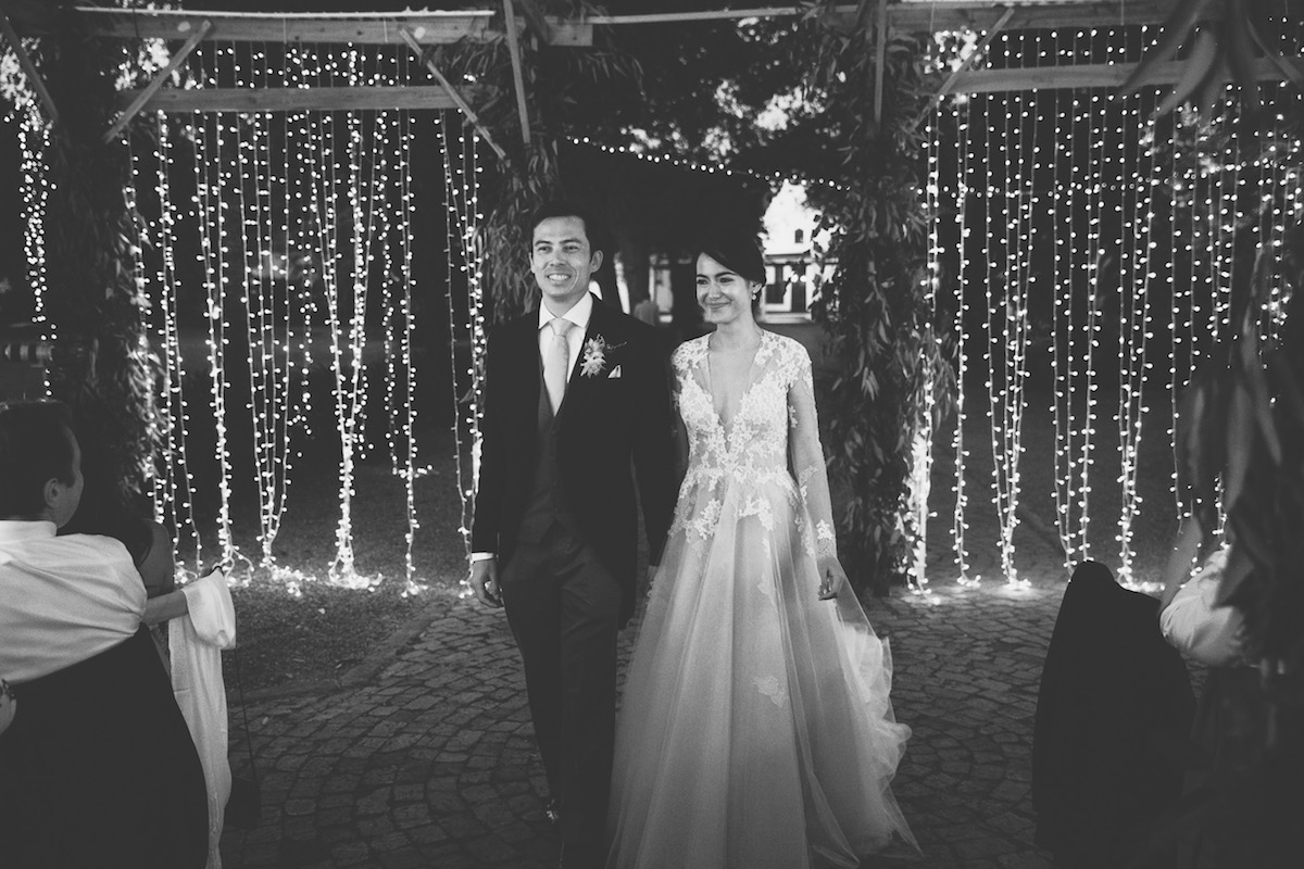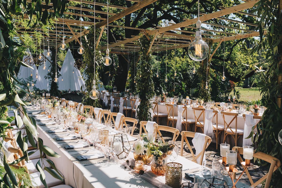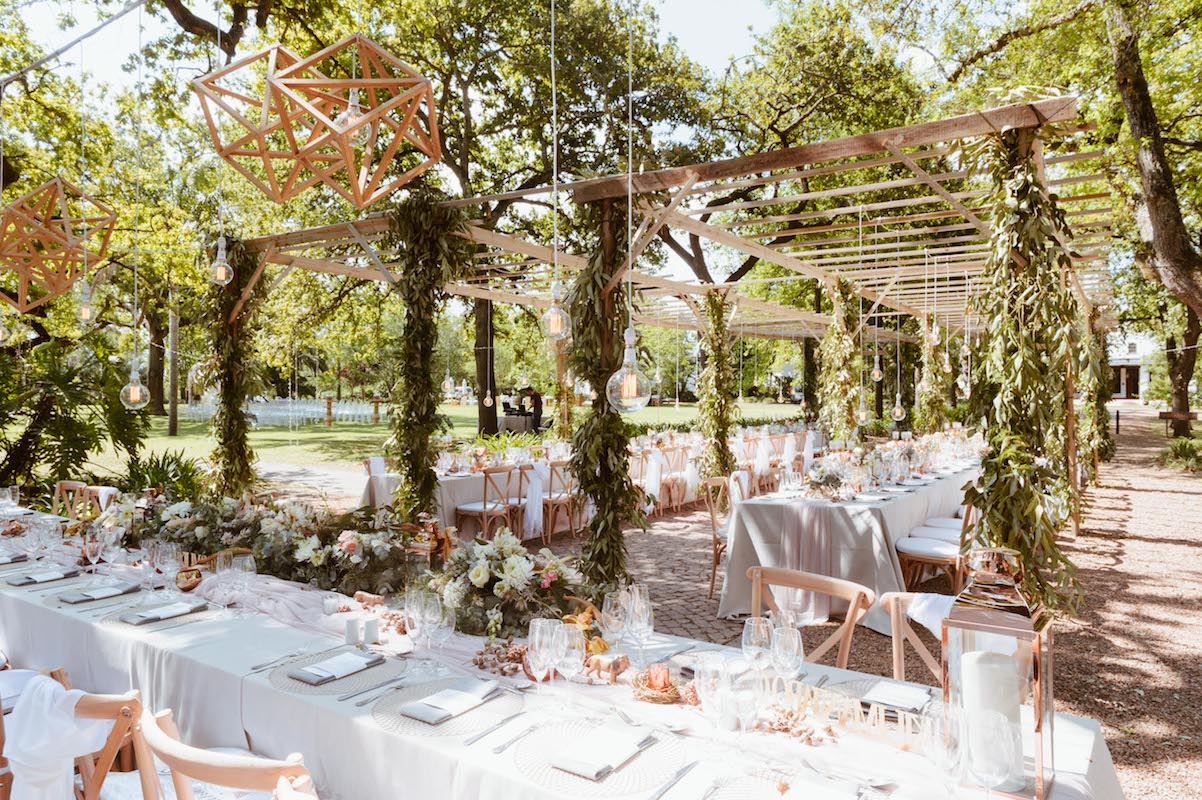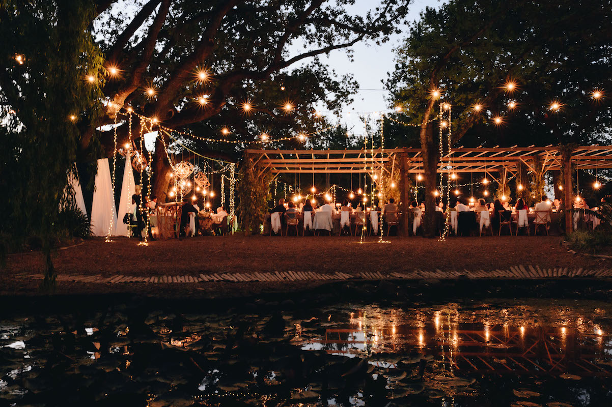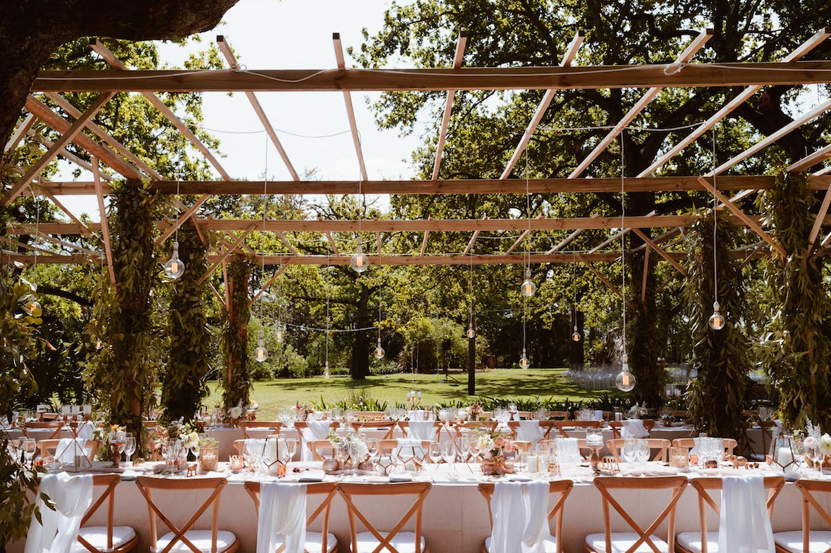 Nooitgedacht luckily provided us with space and scope to do just that and the guests happily “travelled” from one section to the next. The ceremony was held on the lawn, where two big oak trees provided a natural frame for the ceremony (as well as some much needed shade!) Cocktails and canapes were served on a different part of the lawn while a string quartet filled the air with a mix of classical songs and familiar contemporary covers. The reception was held under the starts in the lane lined with trees. We brought some of the greenery and twinkling lights down by covering cabanas with greenery and a mix of fairy lights and naked bulbs. As soon as the last spoon was returned to its empty plate, the guests moved on to their final destination, where they had coffee and cake and danced the night away in the big hall.