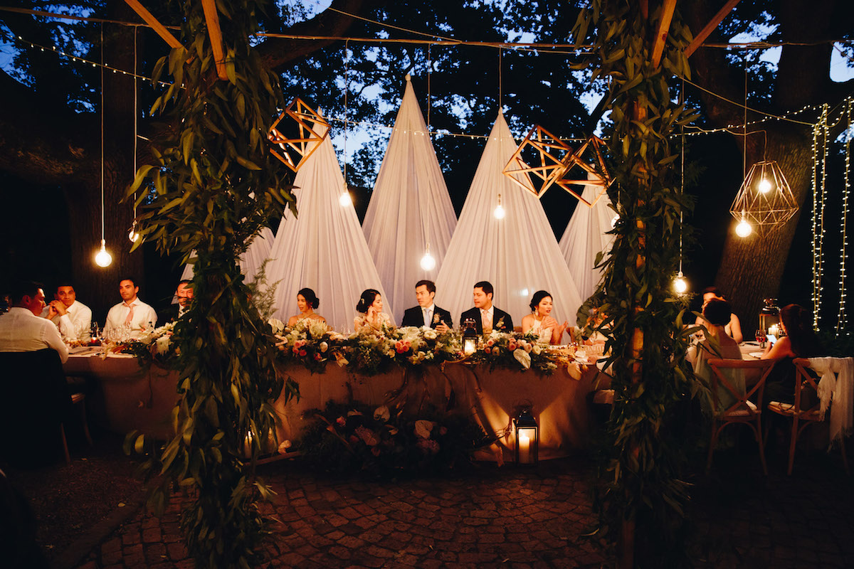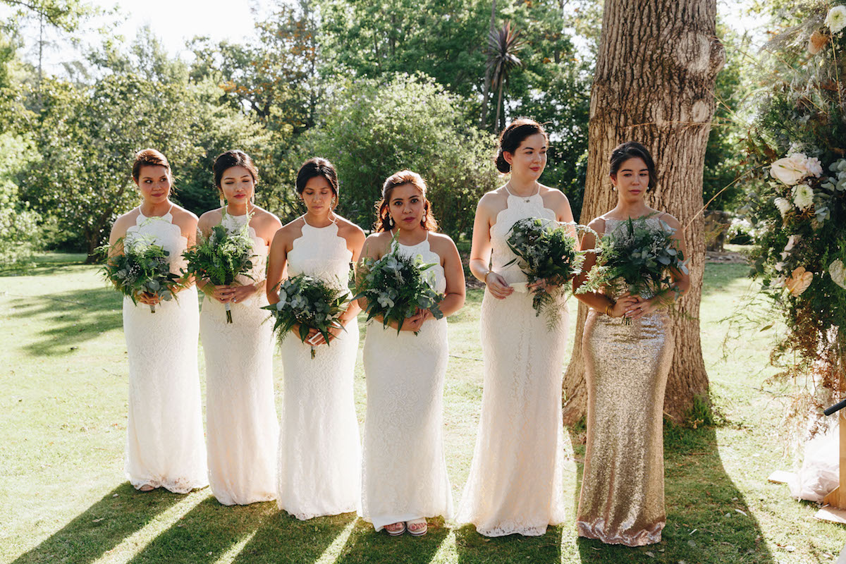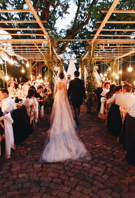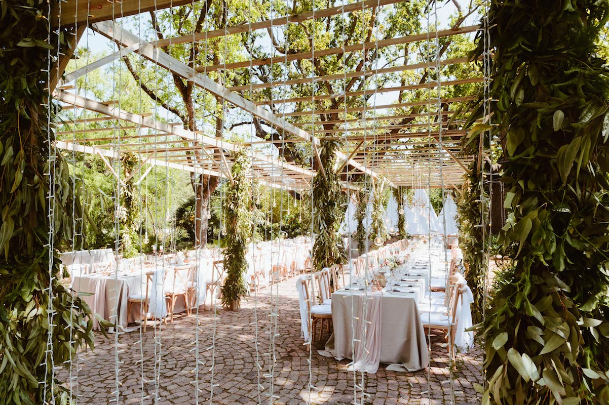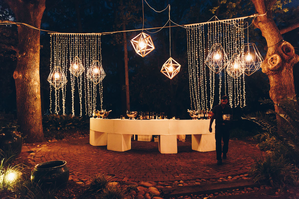 Nooitgedacht luckily provided us with space and scope to do just that and the guests happily “travelled” from one section to the next. The ceremony was held on the lawn, where two big oak trees provided a natural frame for the ceremony (as well as some much needed shade!) Cocktails and canapes were served on a different part of the lawn while a string quartet filled the air with a mix of classical songs and familiar contemporary covers. The reception was held under the starts in the lane lined with trees. We brought some of the greenery and twinkling lights down by covering cabanas with greenery and a mix of fairy lights and naked bulbs. As soon as the last spoon was returned to its empty plate, the guests moved on to their final destination, where they had coffee and cake and danced the night away in the big hall.