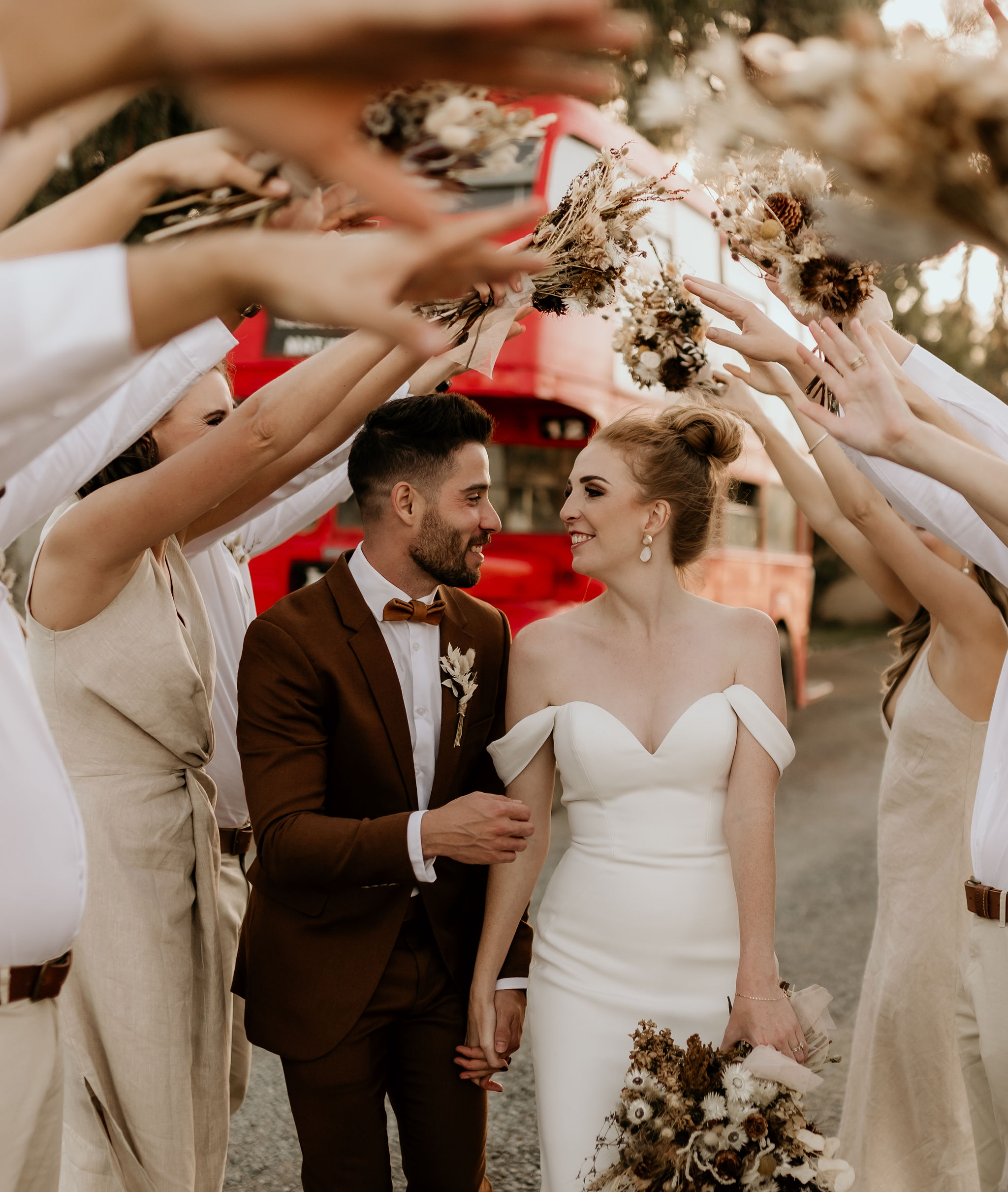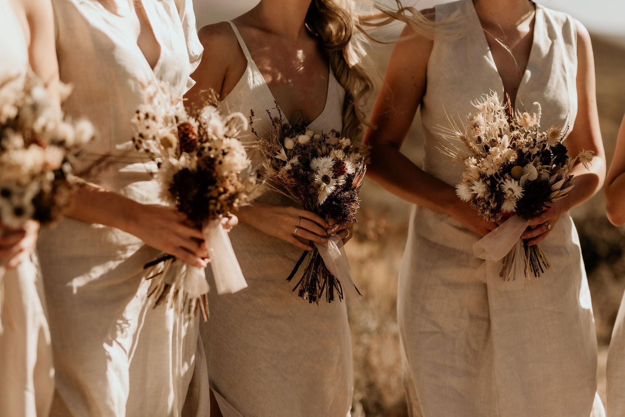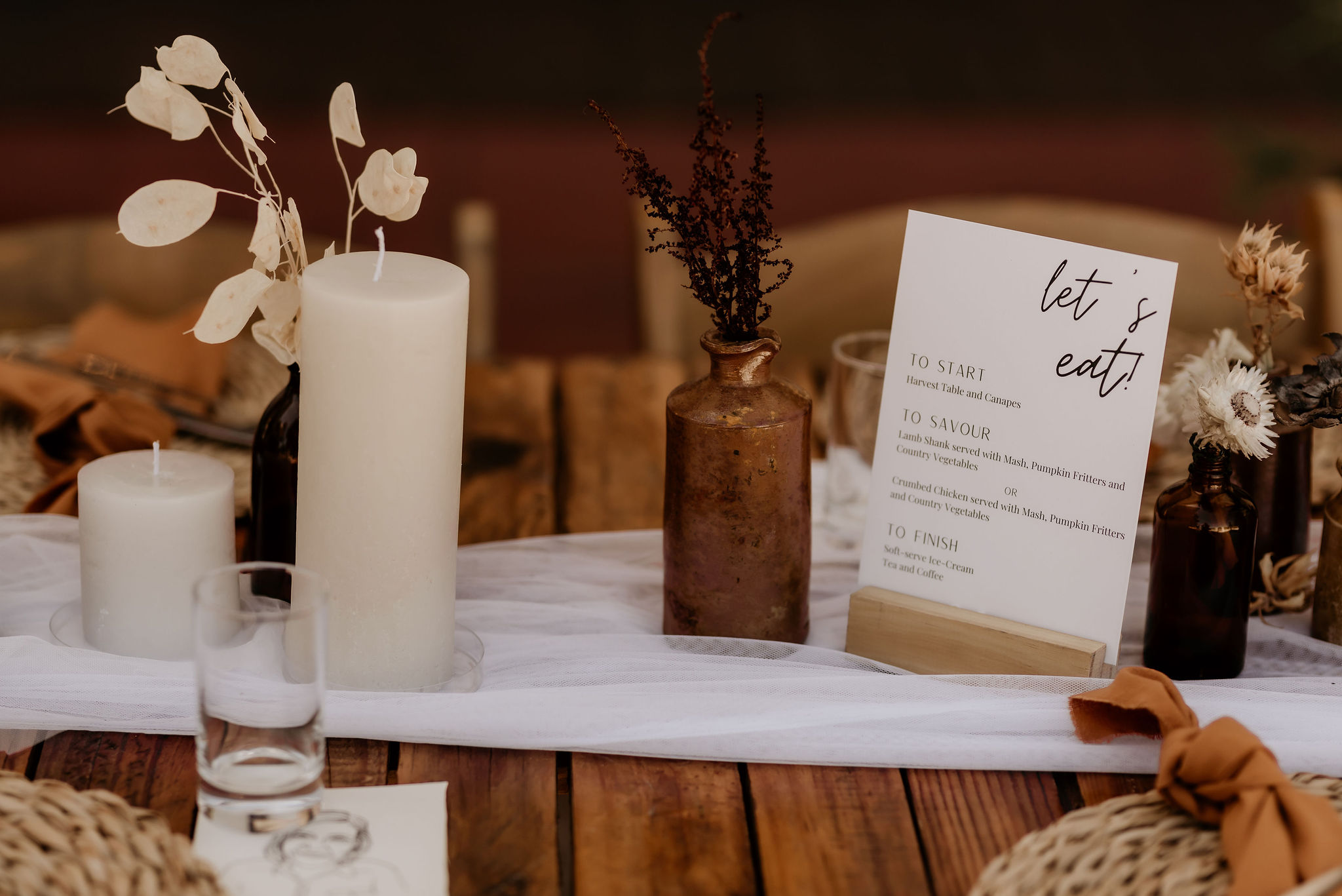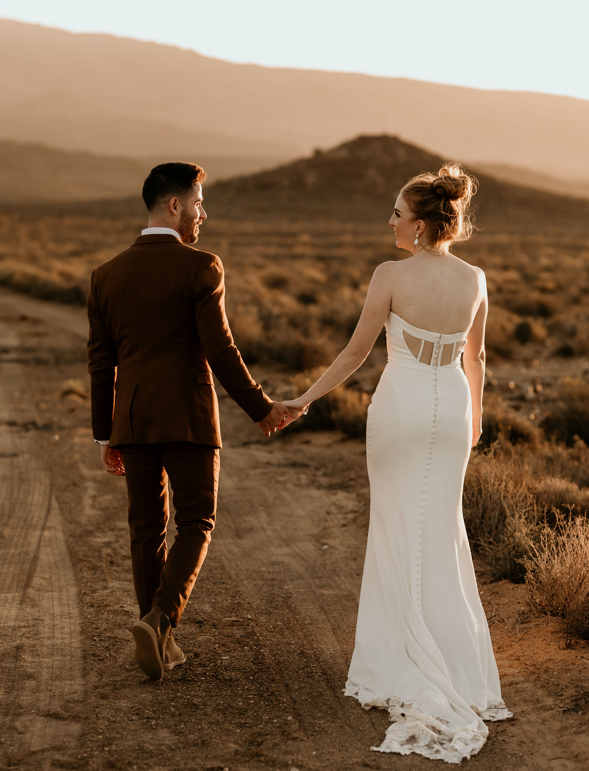 Their stunning Karoo wedding celebrated the landscape with every shade of neutral – from the deep rust brown of the groom’s suit, to the soft off-white of the table linens, raw wood and foraged grasses, it was all there.