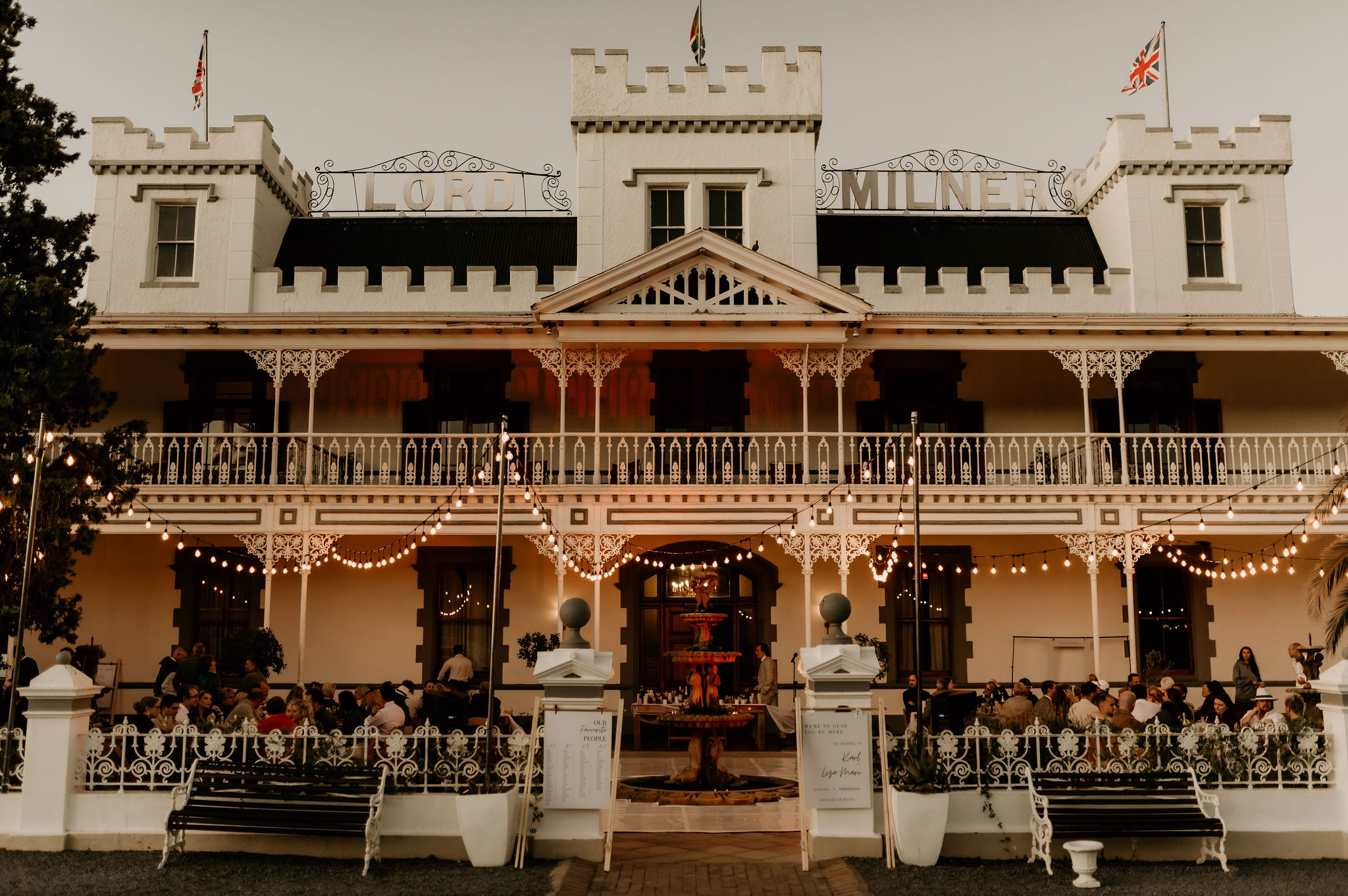 They used up absolutely all the space available with a ceremony out in the open grass fields, pre-drinks on the lawn of one of the beautiful old houses and the reception around the fountain in front of the hotel.